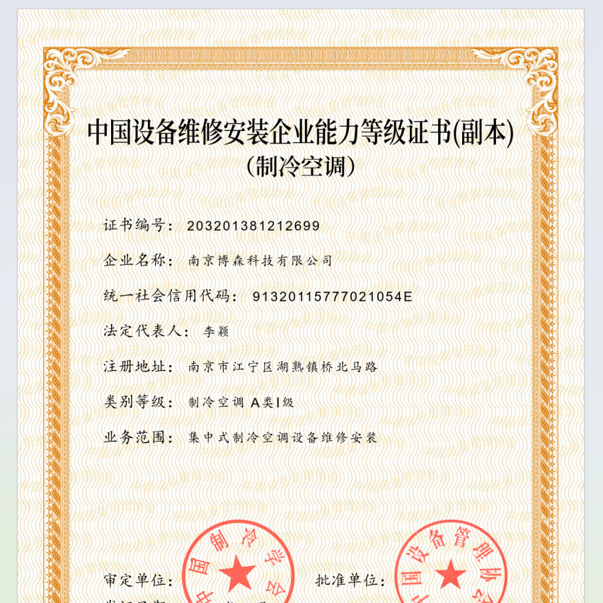 中國(guó)設(shè)備維修安裝企業(yè)能力等級(jí)證書(制冷空調(diào))